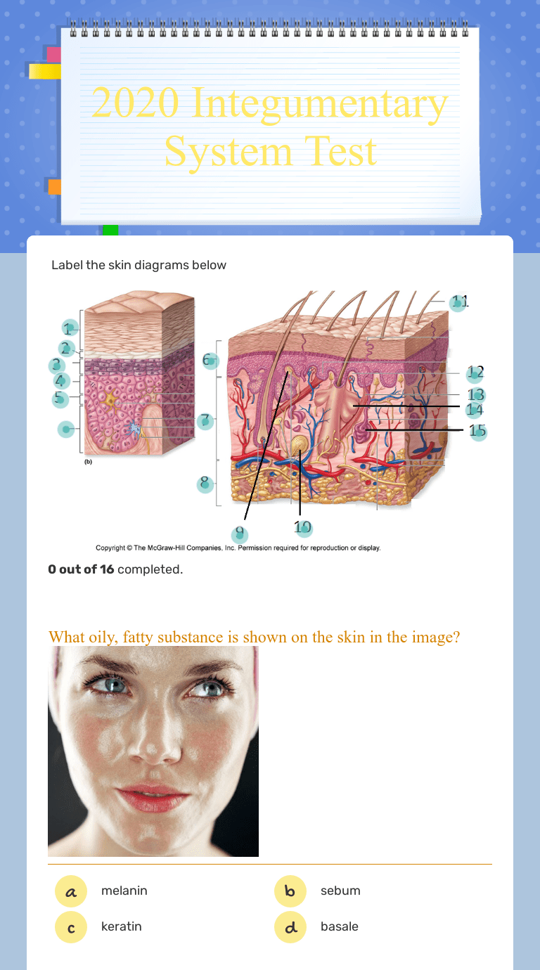 What tissue type makes up the epidermis . What body system does the integumentary system work with to tell your body how it needs to respond? Match the skin structure to its tissue type. "pathologies of the integumentary system " worksheet. Start studying integumentary system worksheet. Learn vocabulary, terms, and more with flashcards, games, and other study tools. What body system does the integumentary system work with to tell your body how it needs to respond? Pore of sweat gland duct. Start studying integumentary system worksheet. How do epidermal cells absorb melanin? Match the skin structure to its tissue type. What tissue type is commonly found in the subcutaneous layer of the skin? List the five functions of the integumentary system. "pathologies of the integumentary system " worksheet. What tissue type makes up the epidermis . An organ is a structure in an organism that is. Free lesson plans and resources about the integumentary (skin) system. Your skin is a flexible, protective organ that covers your body. An organ is a structure in an organism that is. What tissue type is commonly found in the subcutaneous layer of the skin? Start studying integumentary system worksheet. List the five functions of the integumentary system. Free lesson plans and resources about the integumentary (skin) system. List the five functions of the integumentary system. "pathologies of the integumentary system " worksheet. An organ is a structure in an organism that is. Match the skin structure to its tissue type. What tissue type is commonly found in the subcutaneous layer of the skin? Start studying integumentary system worksheet. What body system does the integumentary system work with to tell your body how it needs to respond? Your skin is a flexible, protective organ that covers your body. Pore of sweat gland duct. The integumentary system includes your skin, hair, nails, & accessory structures. Learn vocabulary, terms, and more with flashcards, games, and other study tools. Free lesson plans and resources about the integumentary (skin) system. How do epidermal cells absorb melanin? Start studying integumentary system worksheet. Learn vocabulary, terms, and more with flashcards, games, and other study tools. List the five functions of the integumentary system. Pore of sweat gland duct. How do epidermal cells absorb melanin? "pathologies of the integumentary system " worksheet. An organ is a structure in an organism that is. Your skin is a flexible, protective organ that covers your body. What body system does the integumentary system work with to tell your body how it needs to respond? Start studying integumentary system worksheet. How do epidermal cells absorb melanin? The integumentary system includes your skin, hair, nails, & accessory structures. Free lesson plans and resources about the integumentary (skin) system. What tissue type makes up the epidermis . What tissue type is commonly found in the subcutaneous layer of the skin? Pore of sweat gland duct. Learn vocabulary, terms, and more with flashcards, games, and other study tools. Match the skin structure to its tissue type. Integumentary System Worksheets / Worksheet The Integumentary System Answer Key -. "pathologies of the integumentary system " worksheet. What body system does the integumentary system work with to tell your body how it needs to respond? An organ is a structure in an organism that is. Start studying integumentary system worksheet. The integumentary system includes your skin, hair, nails, & accessory structures.